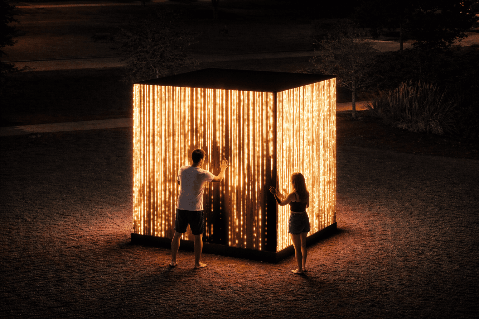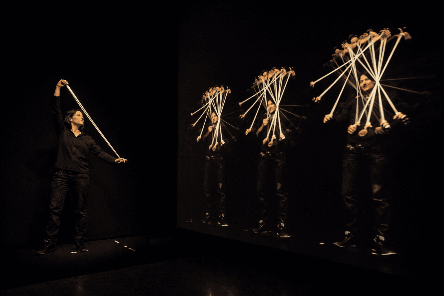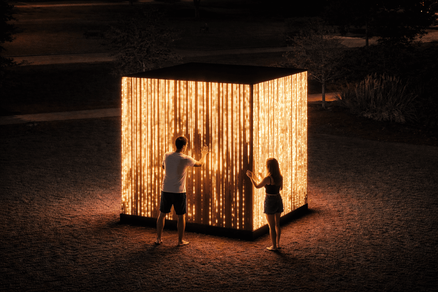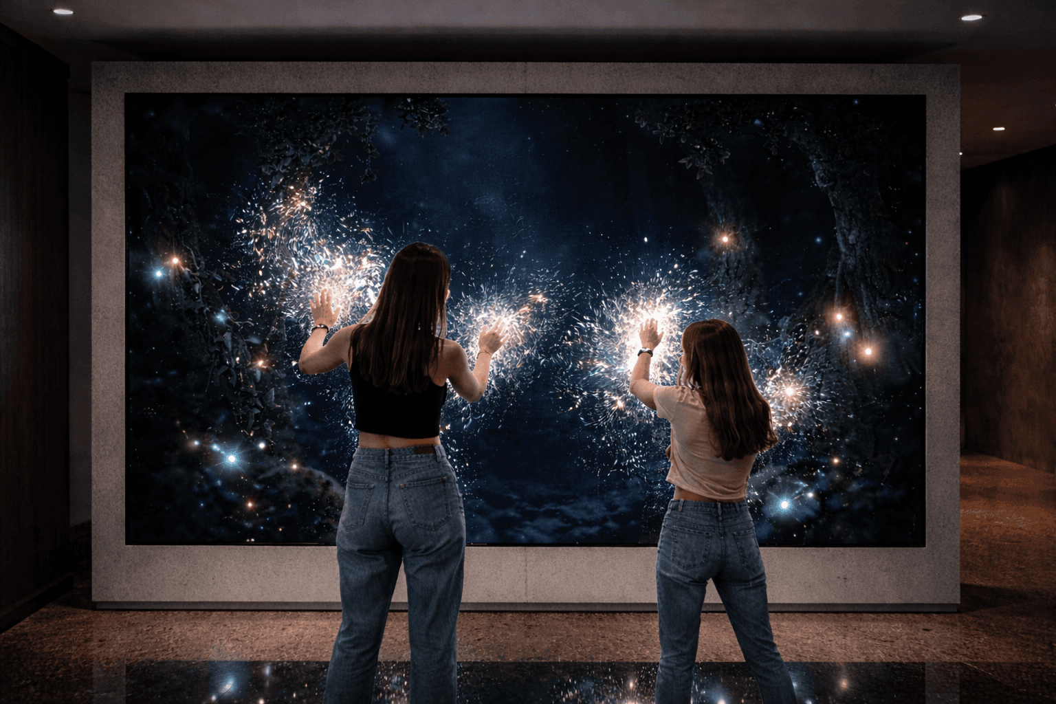 Efectos visuales generados en tiempo real a partir del movimiento de las personas, transformando el espacio en una experiencia viva y reactiva.